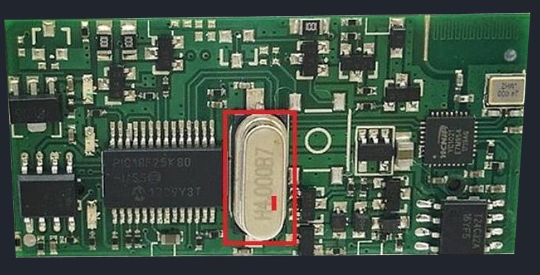 №3. В случае если всё-таки удалось найти нормальное устройство и на оригинальном PIC18F25K80 (в последнее время очень много клонов данной микросхемы), смотрим, на какую частоту установлен кварцевый резонатор (обведен красным на картинке ниже). Там должна фигурировать цифра 4 (ни 8, ни 16, ни т.п.).