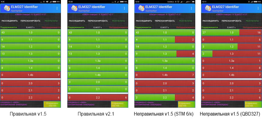 2б) если номер версии не соответствует зеленым полоскам (v1.5 = полоски до 2.1/2.2, скорее всего, подделка, как в пункте 1, но адаптированная под запросы рынка ("выдавать в ELM Identifier побольше зеленых полосок").